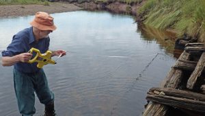 Kerr in 2013 making measurements on an old tidal mill on the Apple River that had recently been exposed by erosion of the salt marsh that had grown over it. View